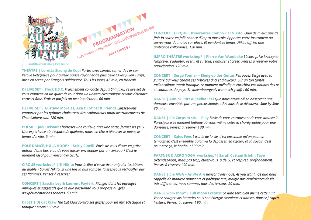 Résolument placée sous le signe de la joie et de la diversité, cette première édition du FESTIVAL RDV AU CARRE BLANC vous invite, du 15 au 22 septembre, à découvrir des pépites artistiques insolites en plein air à l’amphithéâtre du Parc Central au Kirchberg.