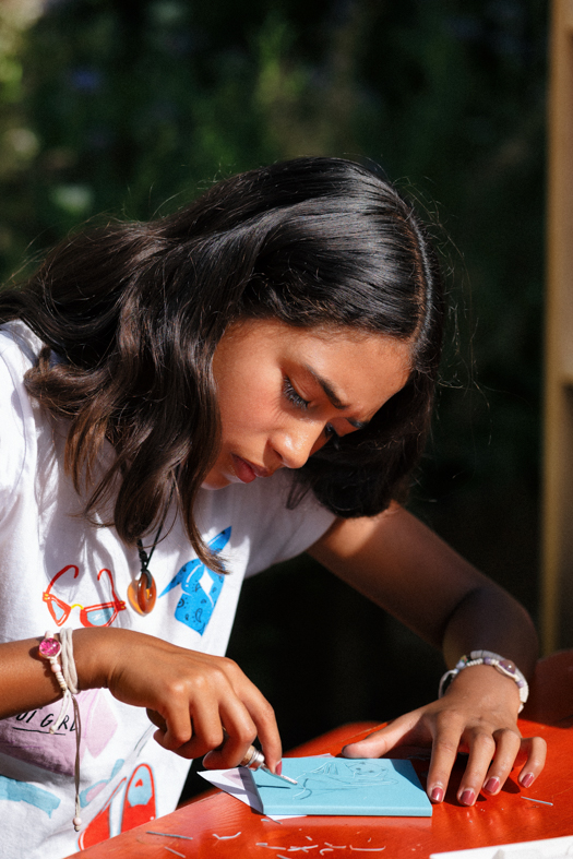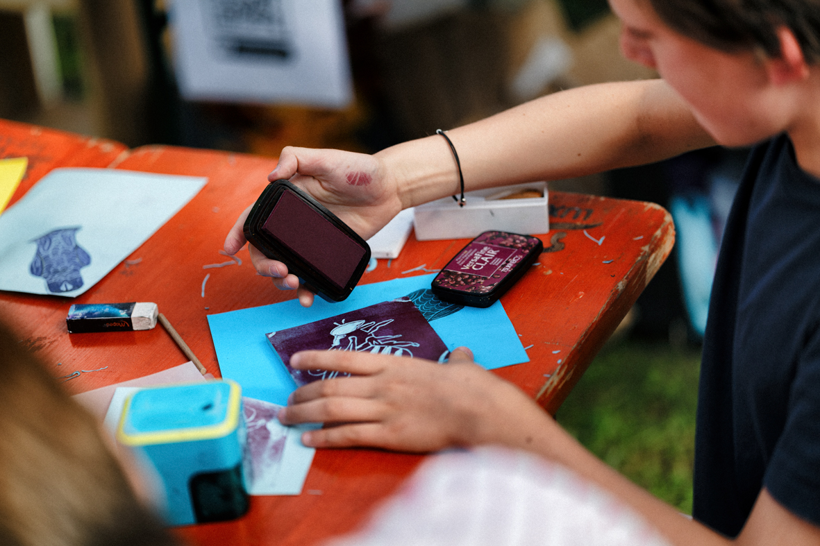 Léa Valet a guidé l’exploration des créatures du potager à travers la gravure avec son atelier mobile. Cet espace artistique unique a permis de s’initier à l’art de la gravure et de donner vie aux animaux du jardin.