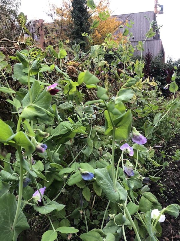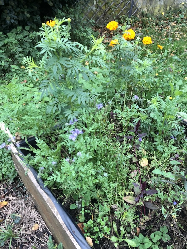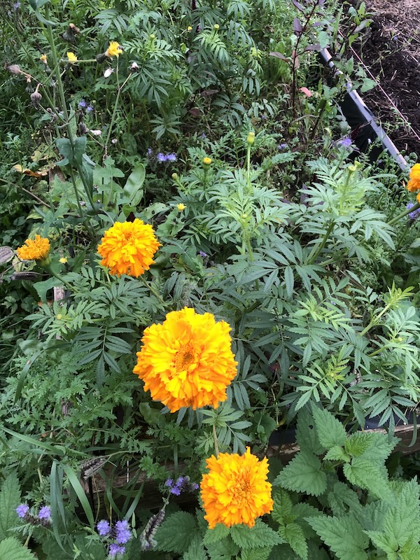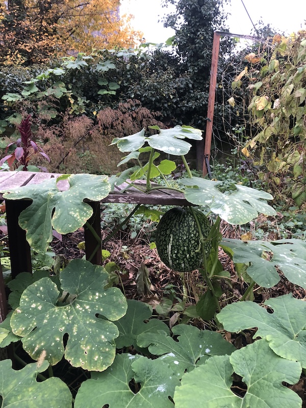 Malgré les jours plus courts et l’air qui se rafraîchit, notre jardin continue de prospérer. On trouve encore des fleurs vibrantes comme la bourrache ou les œillets d’Inde, des champignons, et des légumes comme la courge spaghetti (nom botanique Courge de Siam) qui résistent au froid qui s’installe.