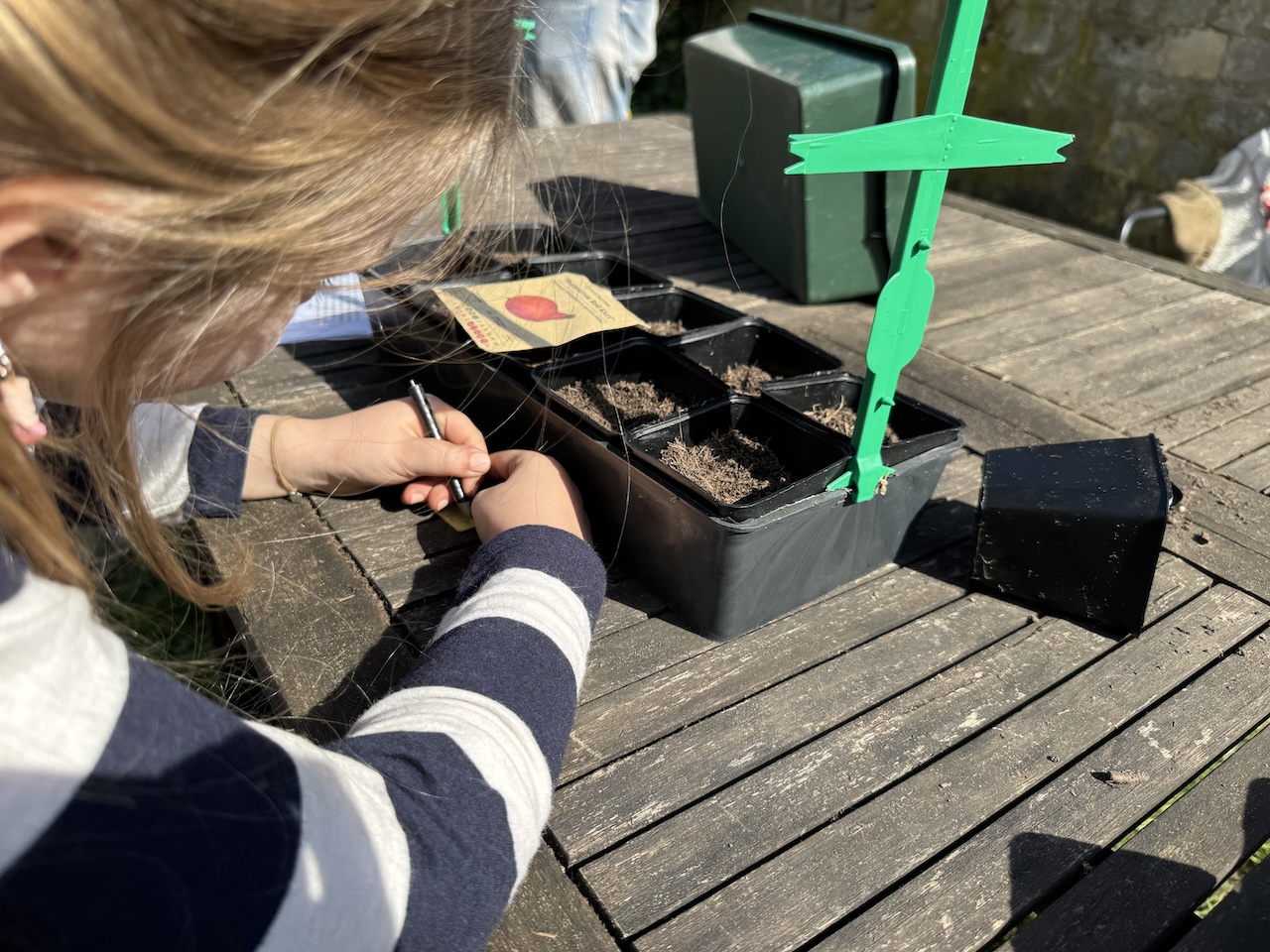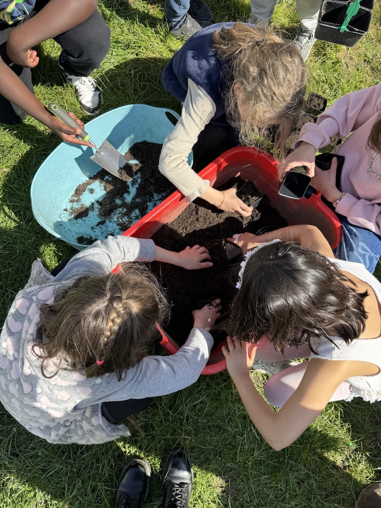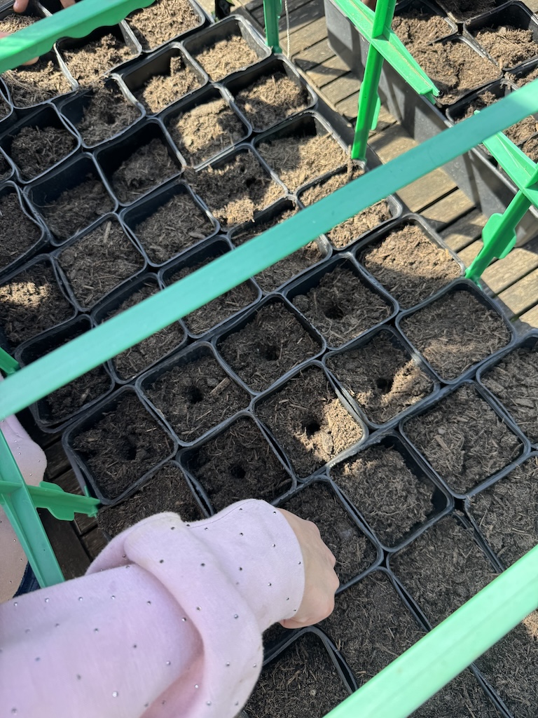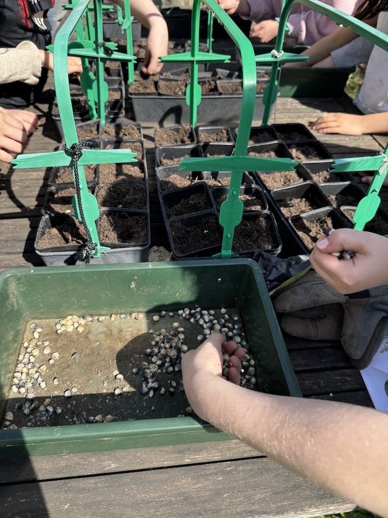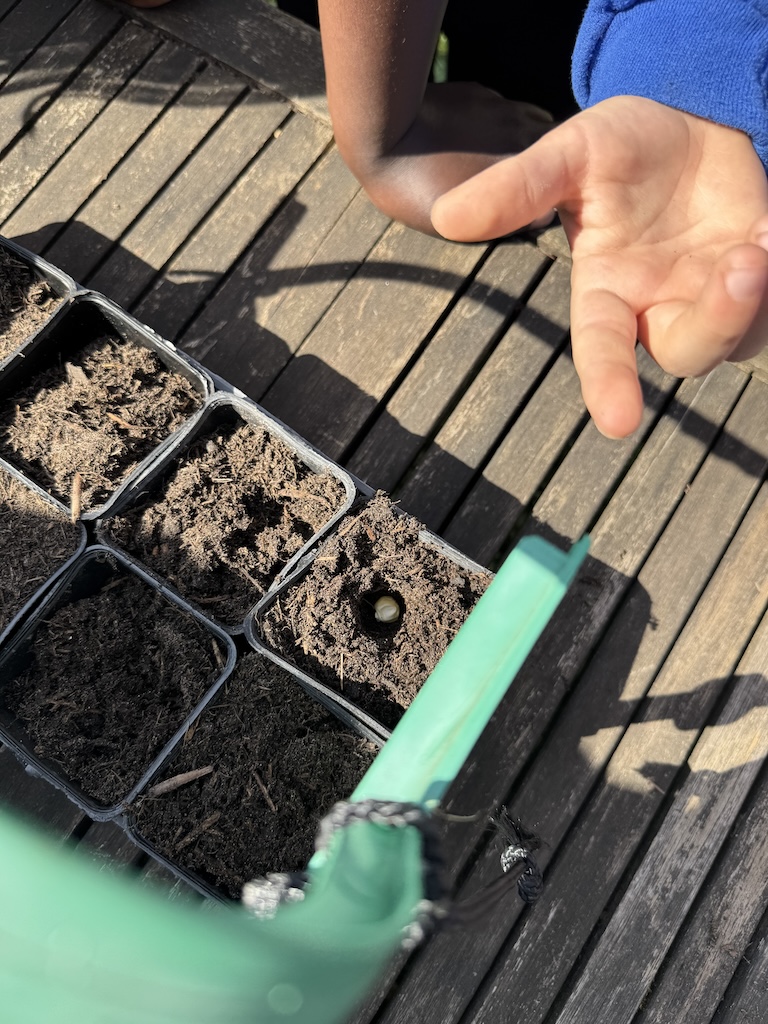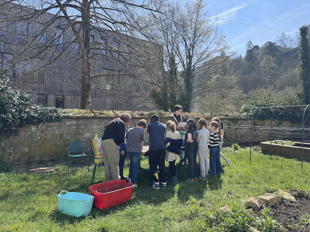 Sous la guidance de François, les enfants ont rempli les pots de terre, préparé le sol et planté les graines. Une fois les graines de maïs et de courges recouvertes de terre et étiquetées, les pots ont été disposés dans le jardin pour être arrosés. Le prochain rendez-vous sera fin avril pour observer les jeunes plants et pour semer les haricots.
