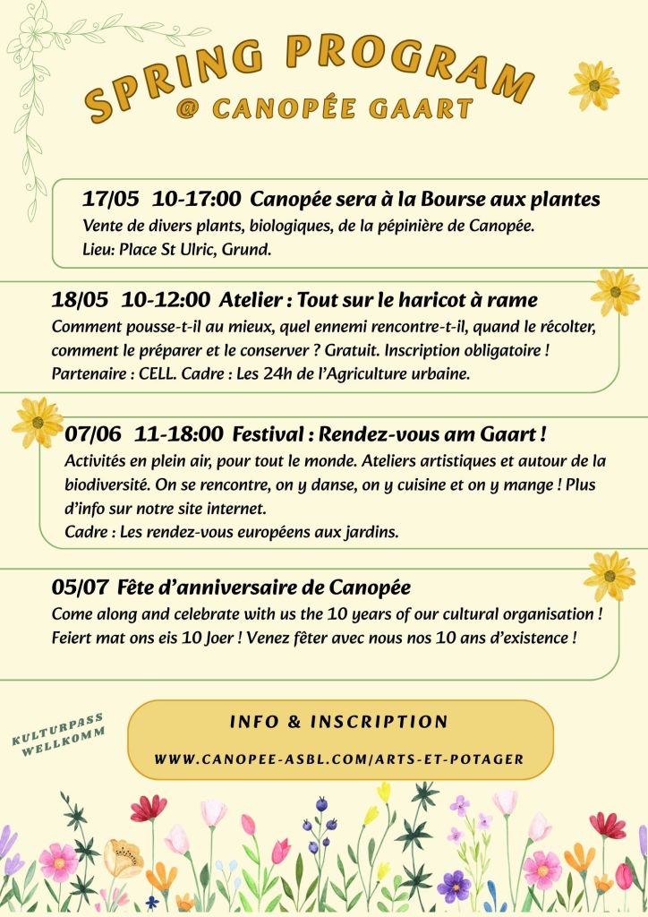 Le 3 avril, nous avons eu le plaisir de lancer un tout nouveau projet dans le cadre du programme d’éveil à la pratique artistique et à la biodiversité ‘Arts & Potager’. Sur toute la saison, d’avril en octobre, un groupe constitué d’enfants de la maison relais Atelier Zeralda viendront régulièrement au potager de Canopée, pour cultiver, observer, récolter et puis cuisiner la culture dite ‘des 3 soeurs’: maïs, haricot et courge. Toutes les étapes seront documentées sous forme de photo, dessin, calcul, description…Le résultat du ‘MAGESCHEN TRIO VUN DER CANOPÉE AM PAFENDALL’ sera exposé (et mangé) lors de notre fameux festival ‘Rendez-vous am Gaart vu Canopée’ le 6 septembre. Les visiteurs pourront découvrir cette méthode ancestrale de culture de légumes parfaitement adaptée à notre climat, et apprendre des découvertes des cultivateurs en herbe !