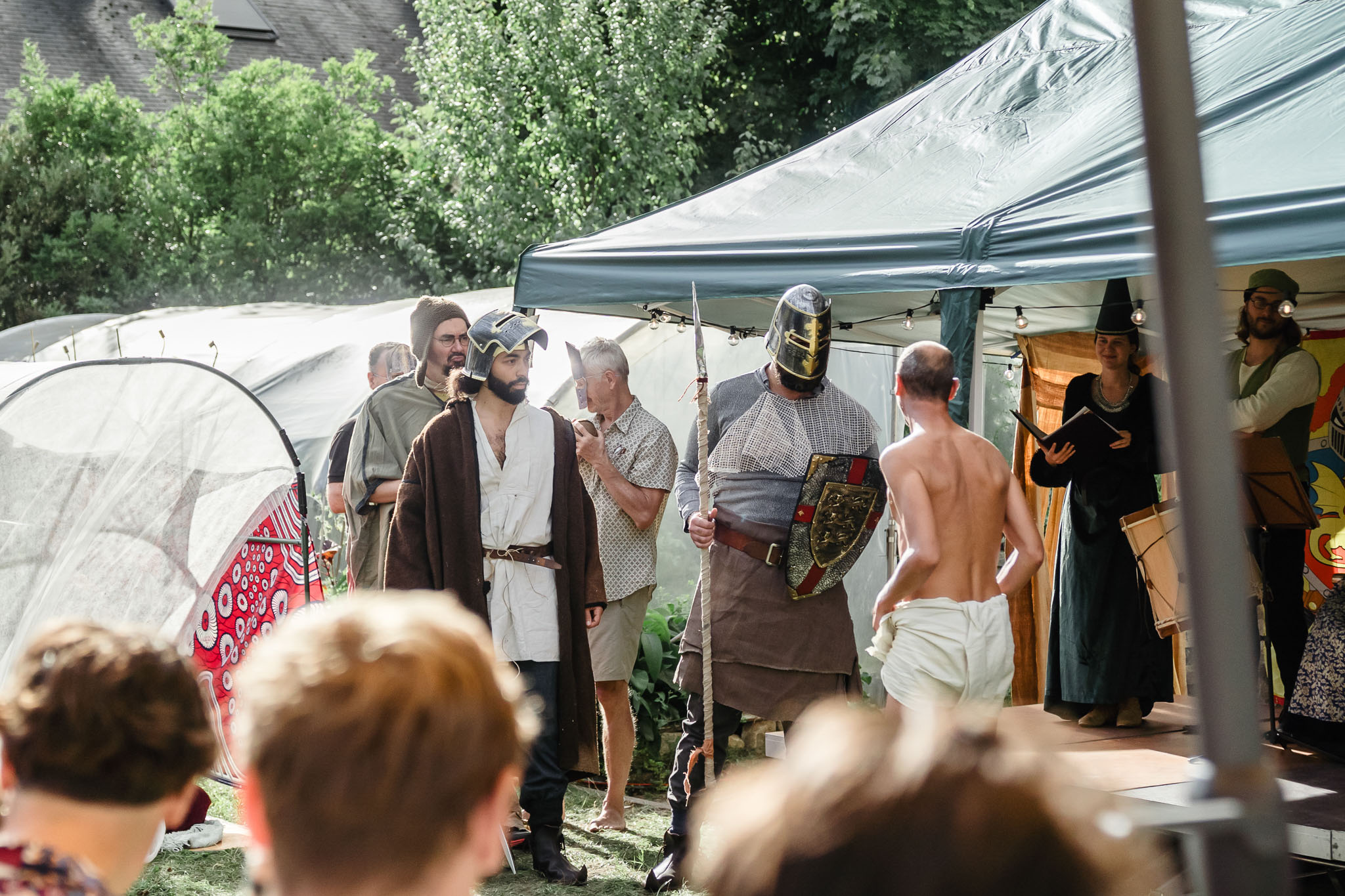 François Baldassare a présenté une performance théâtrale originale mêlant improvisation (obligé, avec seulement 2 répétes ;), personnages surprenants et une touche de folie médiévale. C’était donc l’histoire de Perceval, cet enfant des bois qui part devenir le plus grand chevalier de la Table ronde qui a été revisitée par le metteur en scène et interprétée avec bravoure entre autre par la joyeuse troupe du Cercle d’Acteurs.